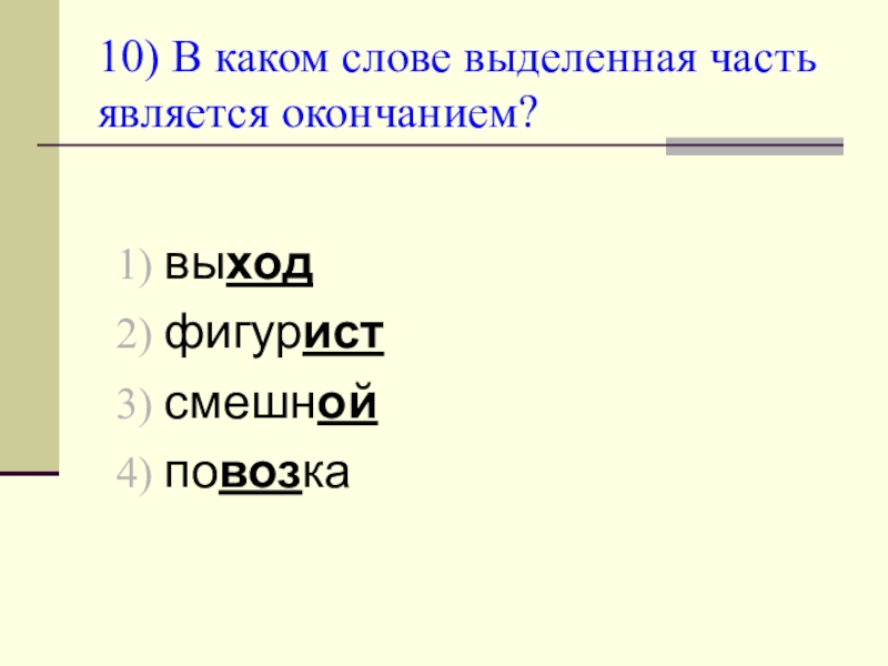 10) В каком слове выделенная часть является окончанием?выходфигуристсмешнойповозка