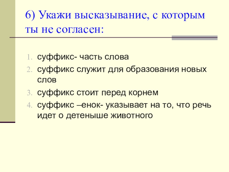 6) Укажи высказывание, с которым ты не согласен:суффикс- часть словасуффикс служит для образования новых словсуффикс стоит перед