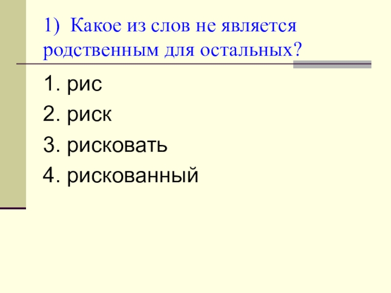1) Какое из слов не является родственным для остальных?1. рис2. риск3. рисковать4. рискованный