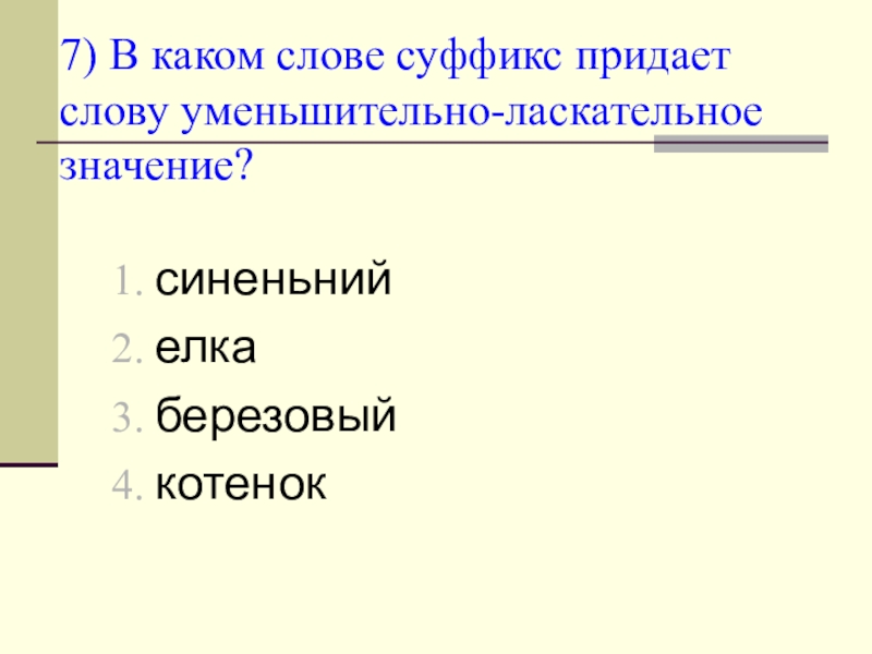 7) В каком слове суффикс придает слову уменьшительно-ласкательное значение?синеньнийелкаберезовыйкотенок