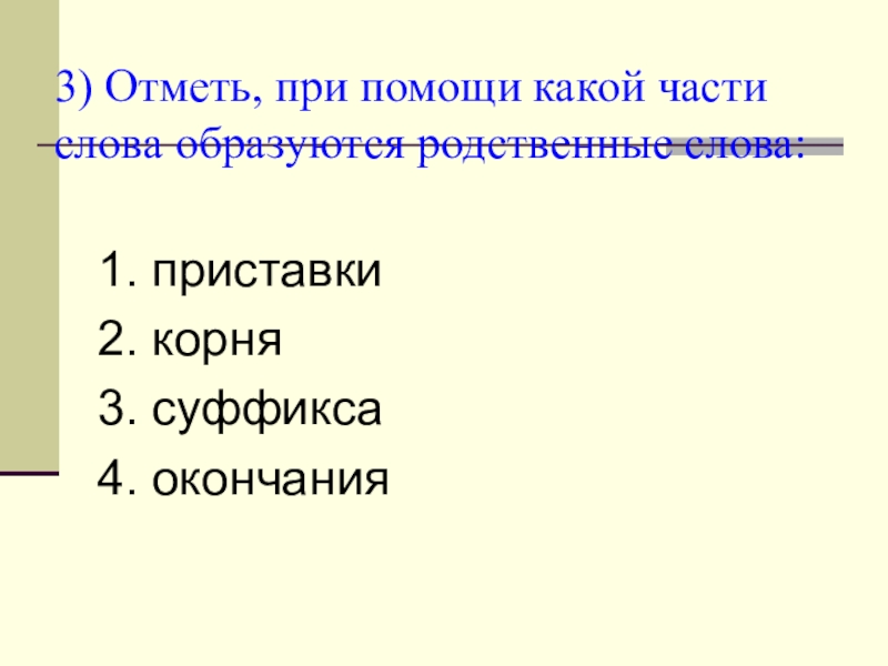 Слайд 43) Отметь, при помощи какой части слова образуются родственные слова:
