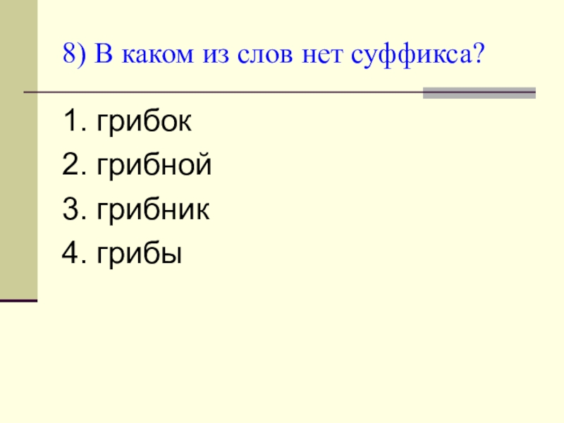 8) В каком из слов нет суффикса?1. грибок2. грибной3. грибник4. грибы