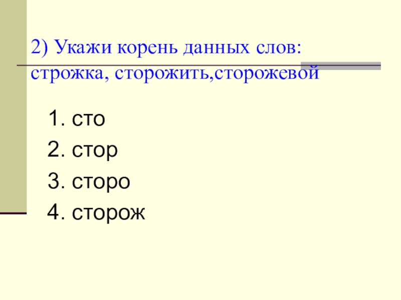 2) Укажи корень данных слов: строжка, сторожить,сторожевой1. сто2. стор3. сторо4. сторож