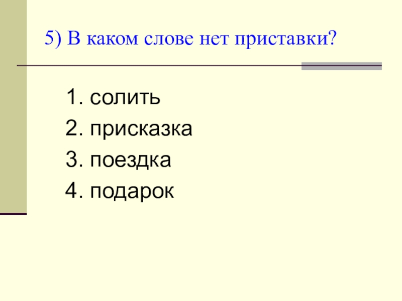 5) В каком слове нет приставки?1. солить2. присказка3. поездка4. подарок