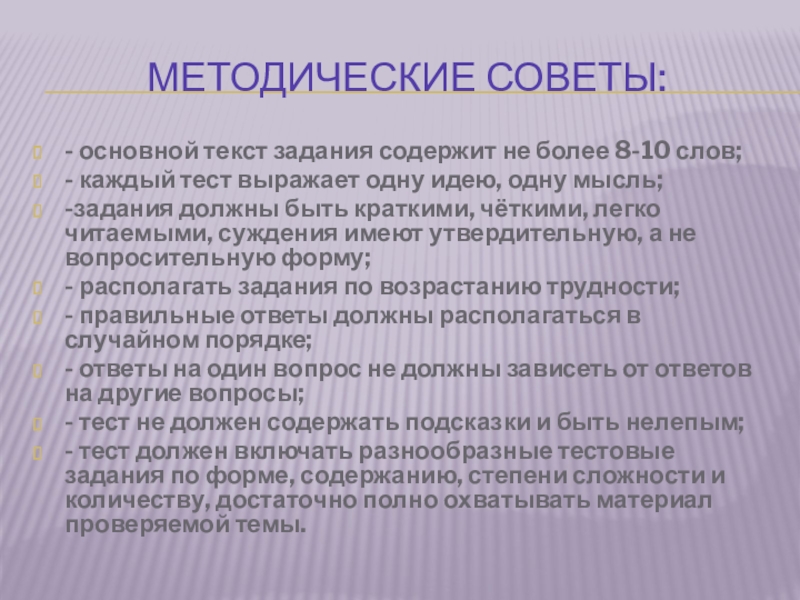 -задания должны быть краткими, чёткими, легко читаемыми, суждения имеют утвердительную, а не вопросительную форму;