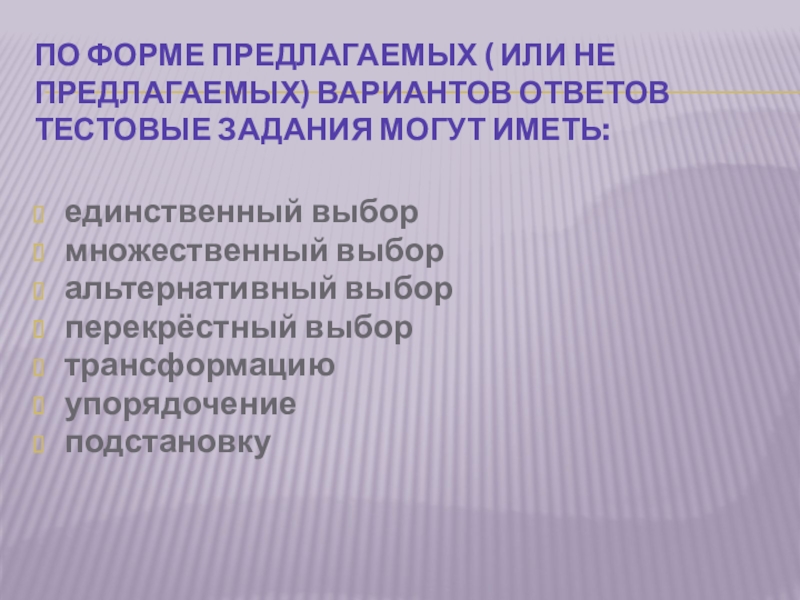 Слайд 16По форме предлагаемых ( или не предлагаемых) вариантов ответов тестовые задания