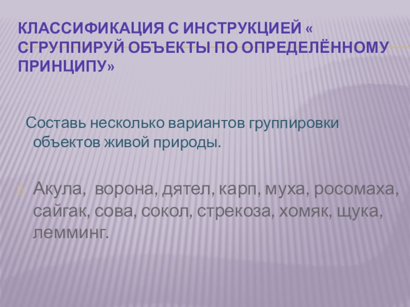 Слайд 15Классификация с инструкцией « сгруппируй объекты по определённому принципу»