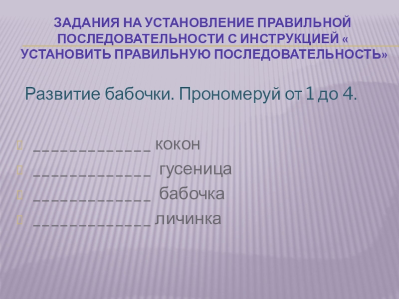 Слайд 14Задания на установление правильной последовательности с инструкцией « установить правильную последовательность»