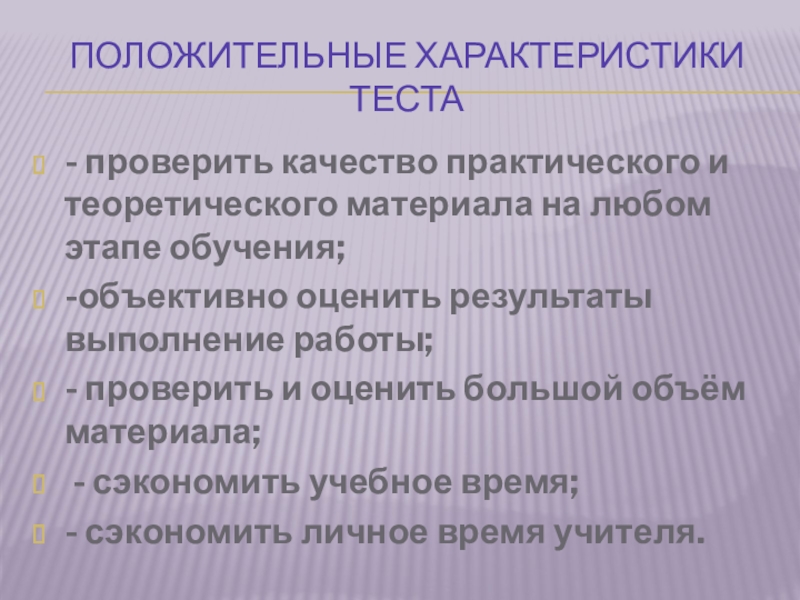 Слайд 9ПОЛОЖИТЕЛЬНЫЕ ХАРАКТЕРИСТИКИ ТЕСТА