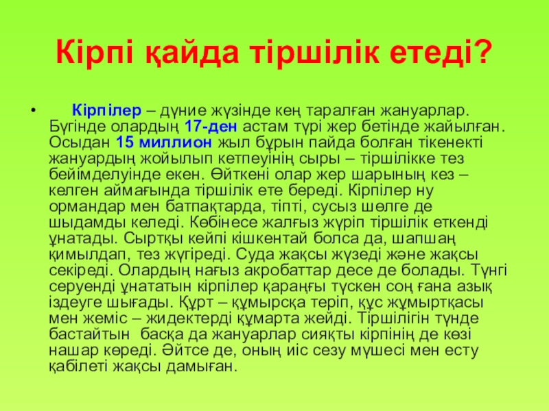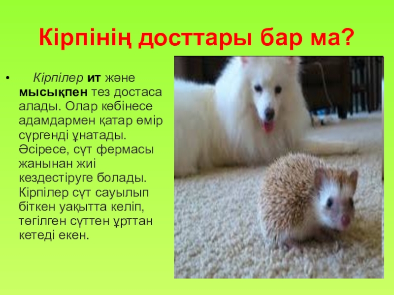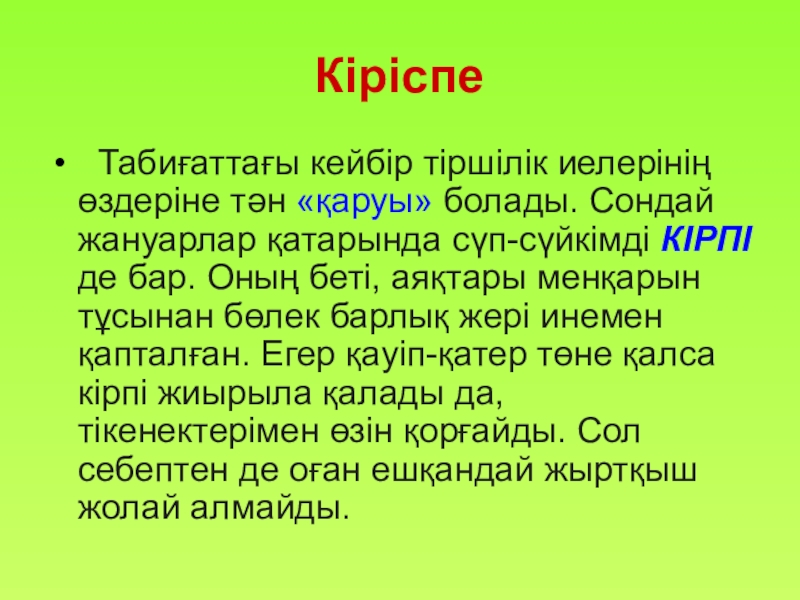 қатарында сүп-сүйкімді КІРПІ де бар. Оның беті, аяқтары менқарын тұсынан бөлек барлық жері инемен қапталған. Егер қауіп-қатер төне қалса кірпі жиырыла қалады да, тікенектерімен өзін қорғайды. Сол себептен де оған ешқандай жыртқыш жолай алмайды.