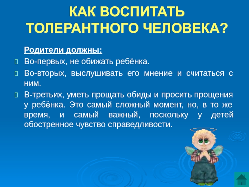 КАК ВОСПИТАТЬ ТОЛЕРАНТНОГО ЧЕЛОВЕКА?   Родители должны:Во-первых, не обижать ребёнка.Во-вторых, выслушивать его мнение и считаться с