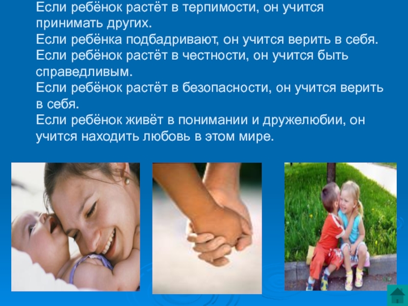 он учится верить в себя. Если ребёнок растёт в честности, он учится быть справедливым. Если ребёнок растёт в безопасности, он учится верить в себя. Если ребёнок живёт в понимании и дружелюбии, он учится находить любовь в этом мире.