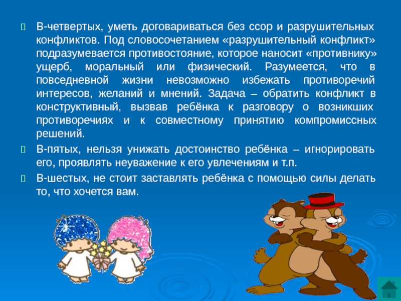 В-четвертых, уметь договариваться без ссор и разрушительных конфликтов. Под словосочетанием «разрушительный конфликт» подразумевается противостояние, которое наносит «противнику»