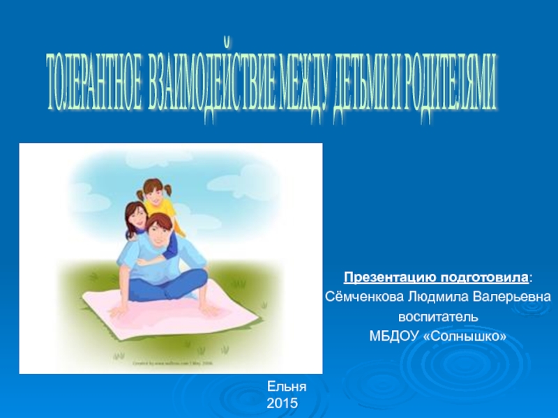 ТОЛЕРАНТНОЕ ВЗАИМОДЕЙСТВИЕ МЕЖДУ ДЕТЬМИ И РОДИТЕЛЯМИ Ельня2015Презентацию подготовила:Сёмченкова Людмила ВалерьевнавоспитательМБДОУ «Солнышко»