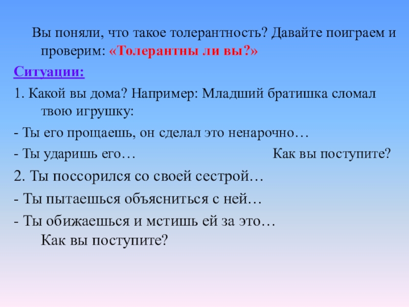 Вы поняли, что такое толерантность? Давайте поиграем и проверим: «Толерантны ли вы?» Ситуации:1. Какой