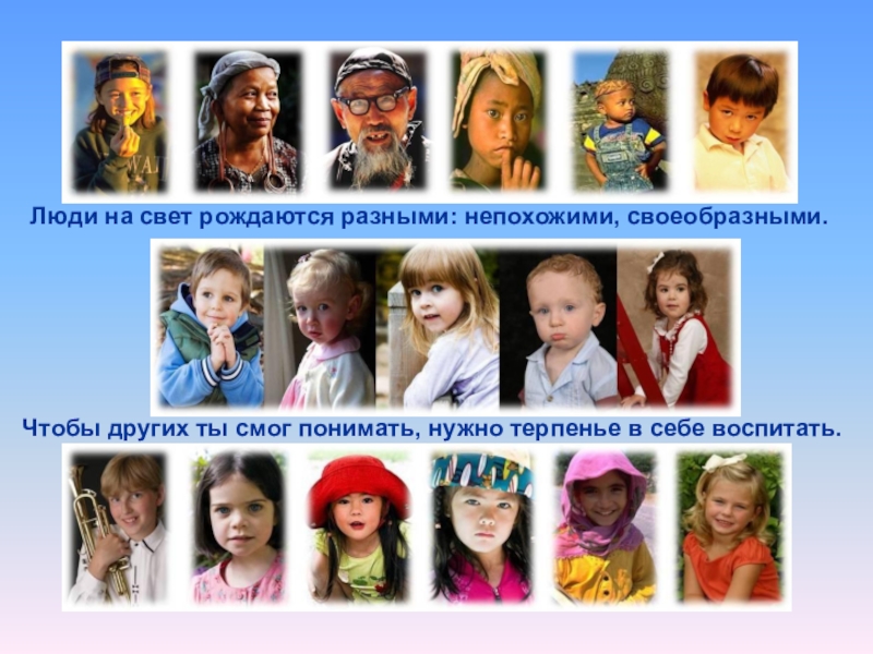Слайд 9Люди на свет рождаются разными: непохожими, своеобразными.