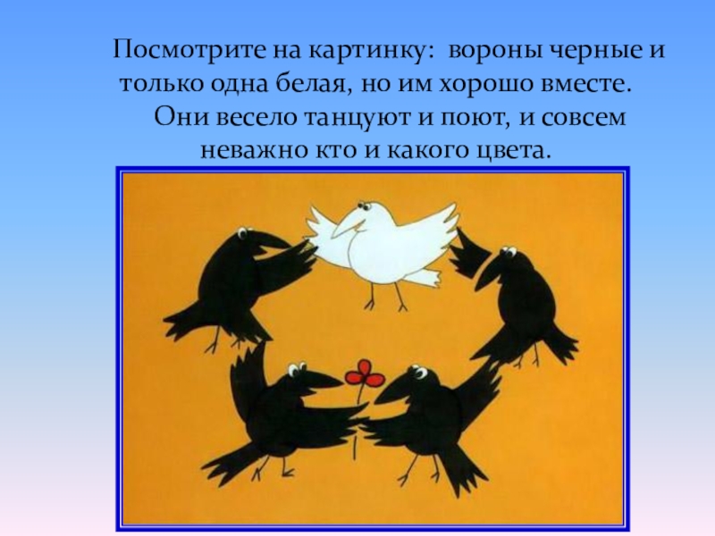 черные и только одна белая, но им хорошо вместе. Они весело танцуют и поют, и совсем неважно кто и какого цвета.