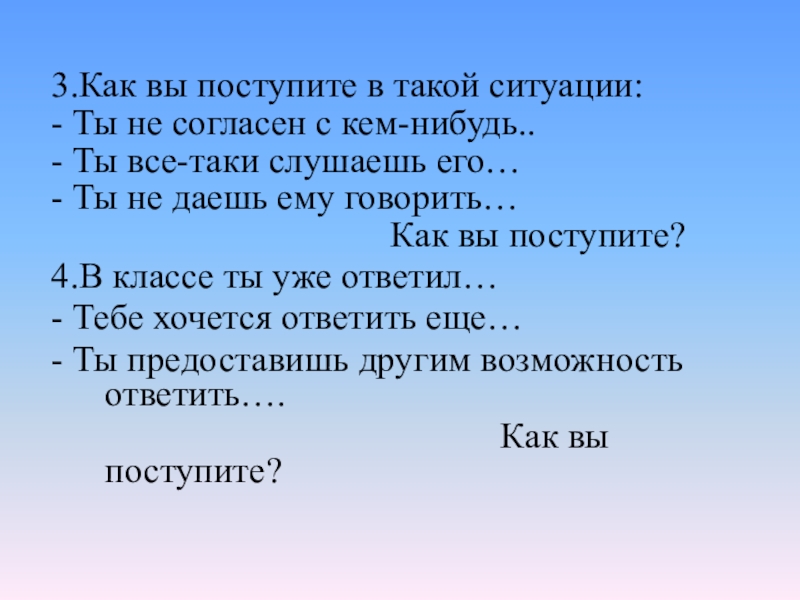 3.Как вы поступите в такой ситуации:- Ты не согласен с кем-нибудь..- Ты все-таки слушаешь его…- Ты не