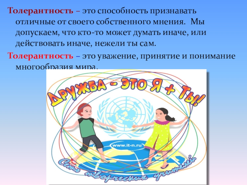 Слайд 4Толерантность – это способность признавать отличные от своего собственного мнения. Мы
