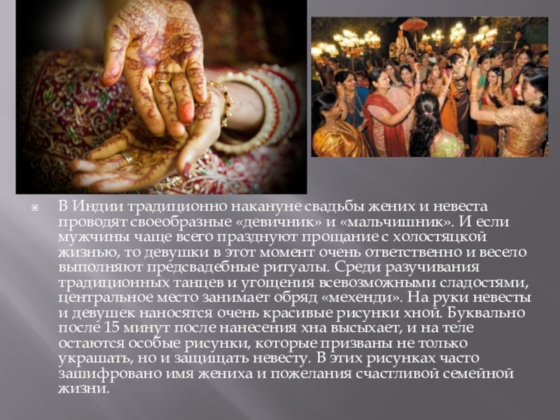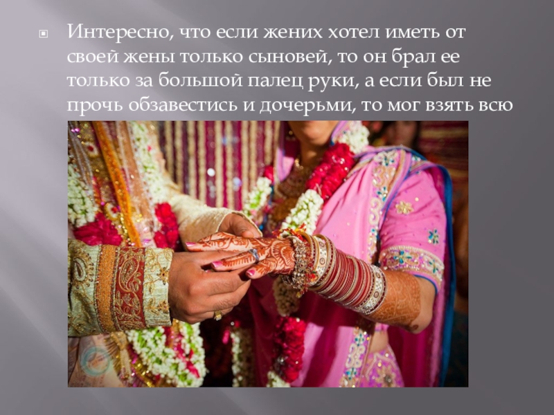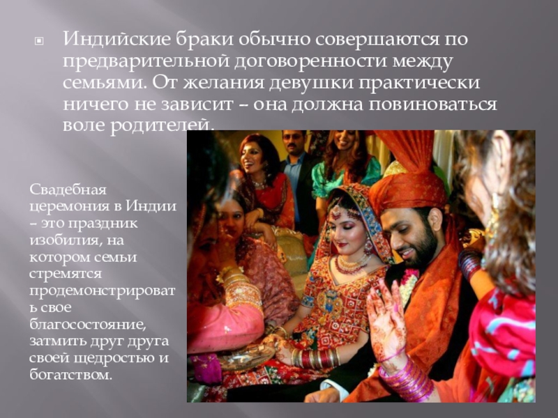 Индийские браки обычно совершаются по предварительной договоренности между семьями. От желания девушки практически ничего не зависит – она должна повиноваться воле родителей.