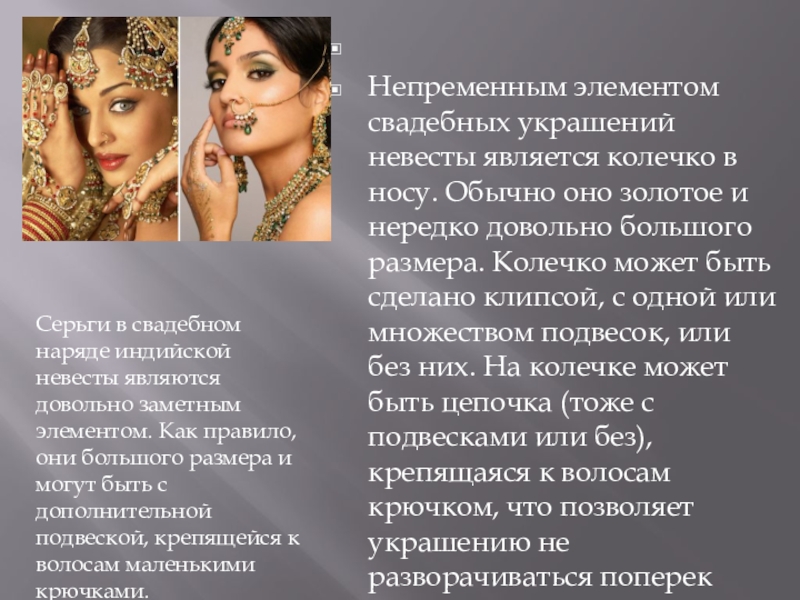 Непременным элементом свадебных украшений невесты является колечко в носу. Обычно оно золотое и нередко довольно большого размера. Колечко может быть сделано клипсой, с одной или множеством подвесок, или без них. На колечке может быть цепочка (тоже с подвесками или без), крепящаяся к волосам крючком, что позволяет украшению не разворачиваться поперек лица.