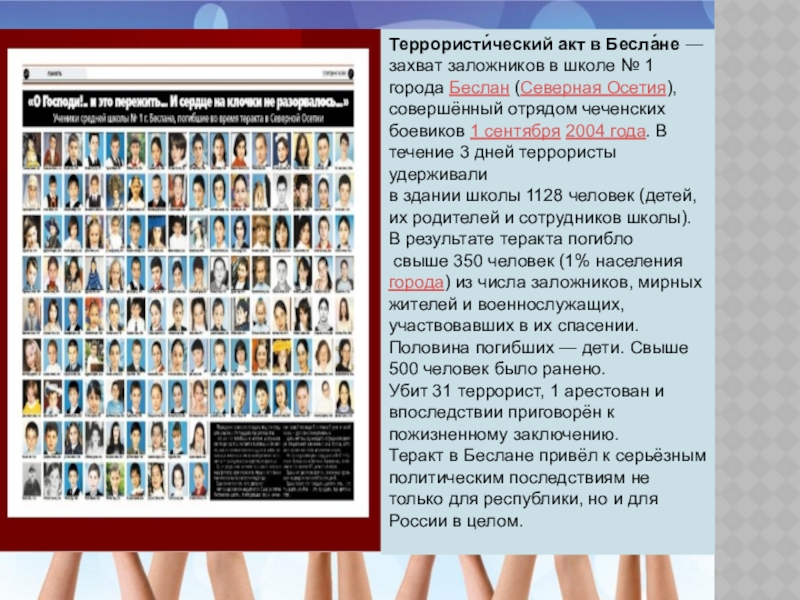 Слайд 7Террористи́ческий акт в Бесла́не — захват заложников в школе № 1