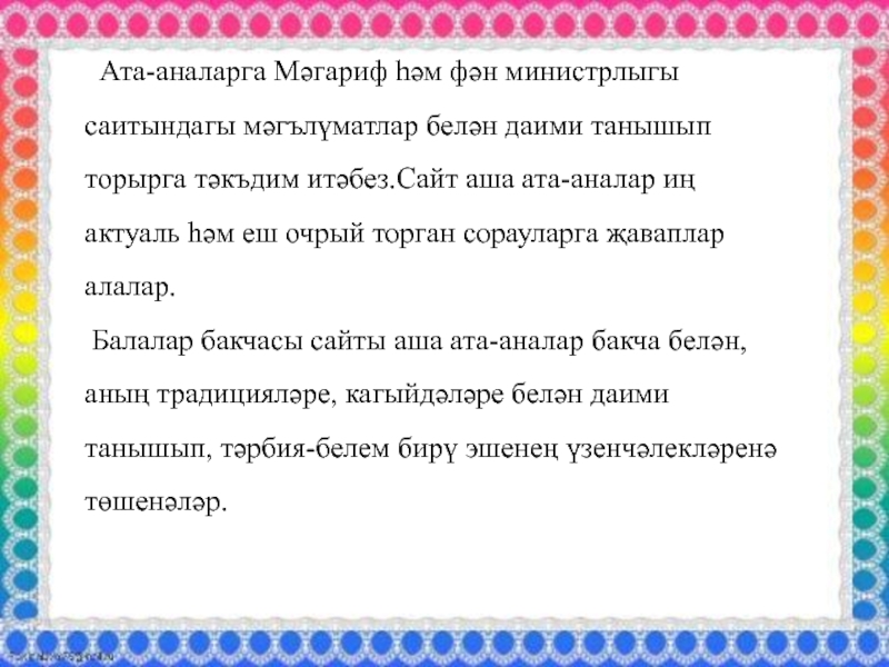 даими танышып торырга тәкъдим итәбез.Сайт аша ата-аналар иң актуаль һәм еш очрый торган сорауларга җаваплар алалар.