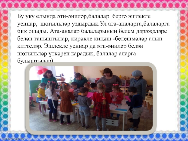 Слайд 18Бу уку елында әти-әниләр,балалар бергә эшлекле уеннар, шөгыльләр уздырдык.Ул ата-аналарга,балаларга бик