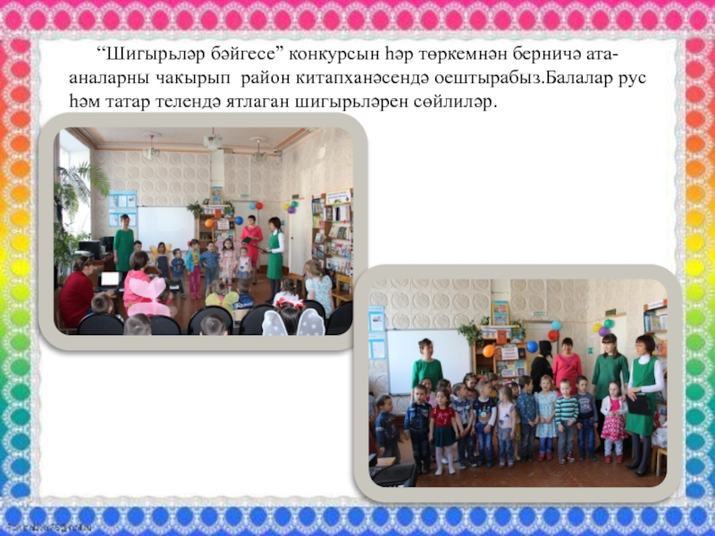 берничә ата-аналарны чакырып район китапханәсендә оештырабыз.Балалар рус һәм татар телендә ятлаган шигырьләрен сөйлиләр.