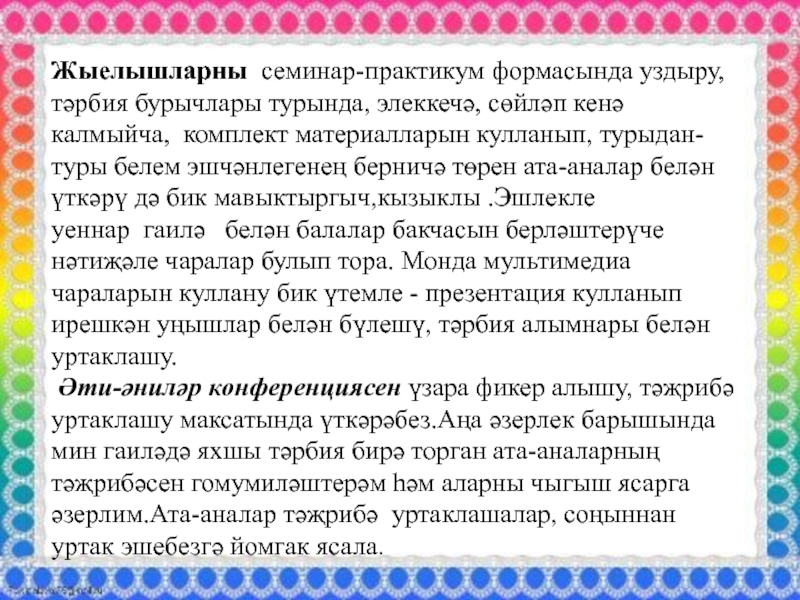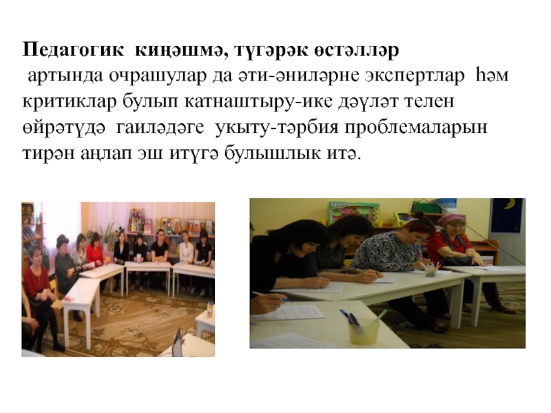 Жыелышларны семинар-практикум формасында уздыру, тәрбия бурычлары турында, элеккечә, сөйләп