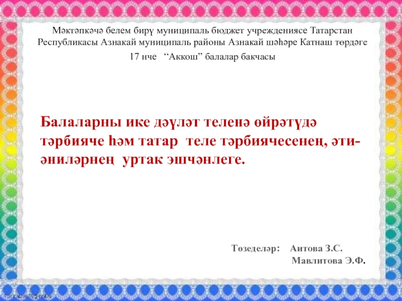 Слайд 1Мәктәпкәчә белем бирү муниципаль бюджет учреждениясе Татарстан Республикасы Азнакай муниципаль районы