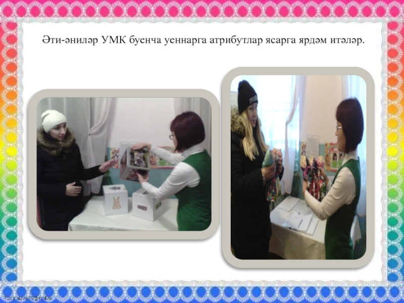 Слайд 21Әти-әниләр УМК буенча уеннарга атрибутлар ясарга ярдәм итәләр.