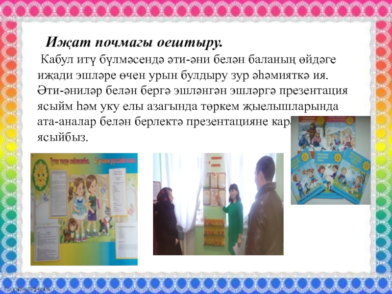 белән баланың өйдәге иҗади эшләре өчен урын булдыру зур әһәмияткә ия. Әти-әниләр белән бергә эшләнгән эшләргә презентация ясыйм һәм уку елы азагында төркем җыелышларында ата-аналар белән берлектә презентацияне карап йомгак ясыйбыз.