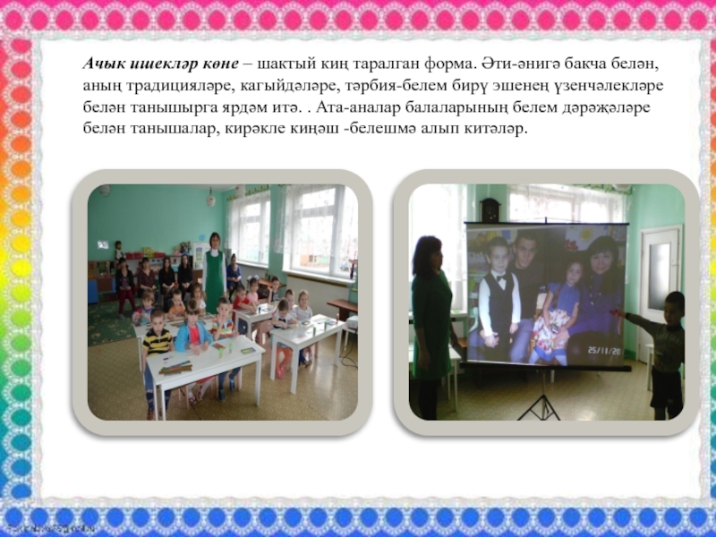 Слайд 17Ачык ишекләр көне – шактый киң таралган форма. Әти-әнигә бакча белән, аның