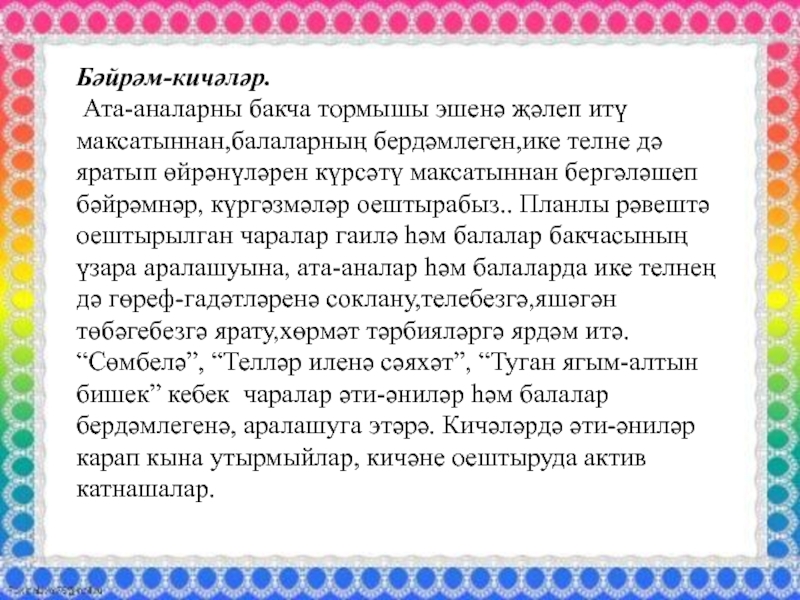 дә яратып өйрәнүләрен күрсәтү максатыннан бергәләшеп бәйрәмнәр, күргәзмәләр оештырабыз.. Планлы рәвештә оештырылган чаралар гаилә һәм балалар бакчасының үзара аралашуына, ата-аналар һәм балаларда ике телнең дә гөреф-гадәтләренә соклану,телебезгә,яшәгән төбәгебезгә ярату,хөрмәт тәрбияләргә ярдәм итә. “Сөмбелә”, “Телләр иленә сәяхәт”, “Туган ягым-алтын бишек” кебек чаралар әти-әниләр һәм балалар бердәмлегенә, аралашуга этәрә. Кичәләрдә әти-әниләр карап кына утырмыйлар, кичәне оештыруда актив катнашалар.