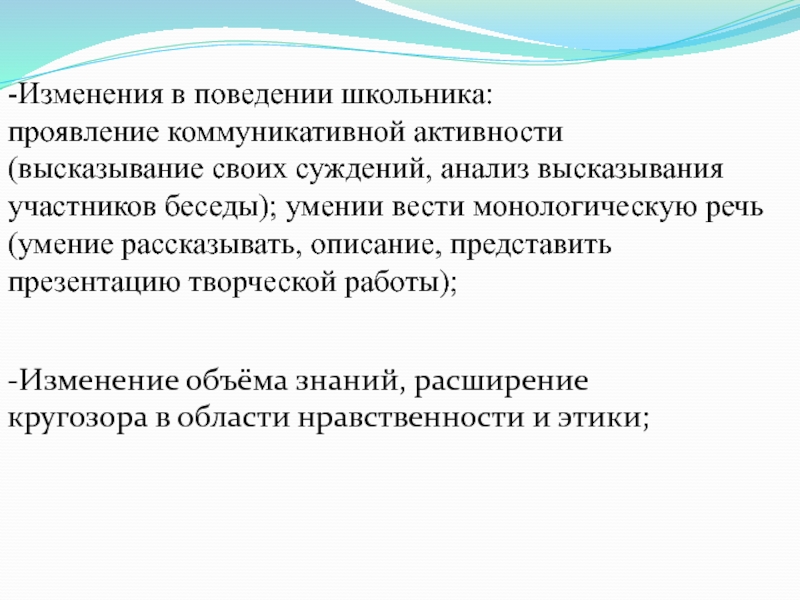 -Изменение объёма знаний, расширение кругозора в области нравственности и этики;