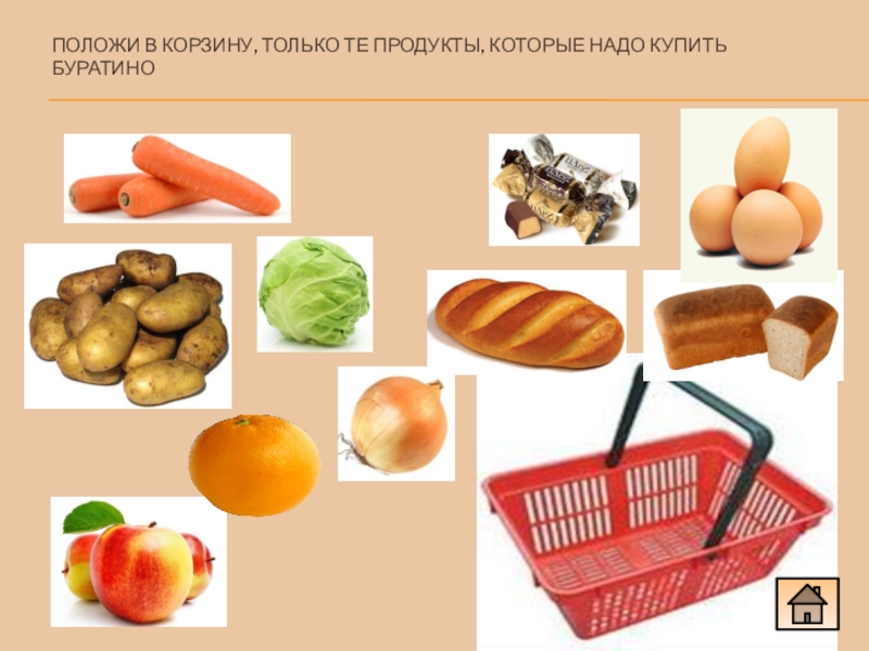 Положи в корзину, только те продукты, которые надо купить Буратино