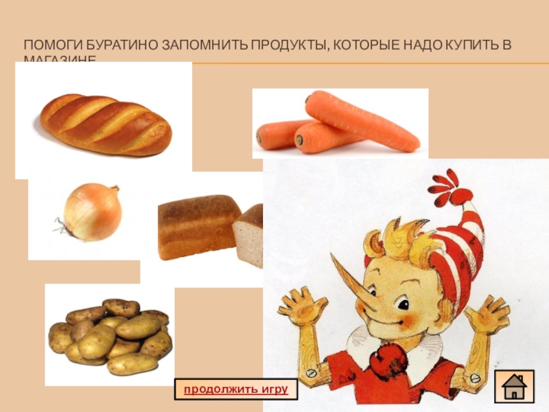 Помоги Буратино запомнить продукты, которые надо купить в магазине.продолжить игру