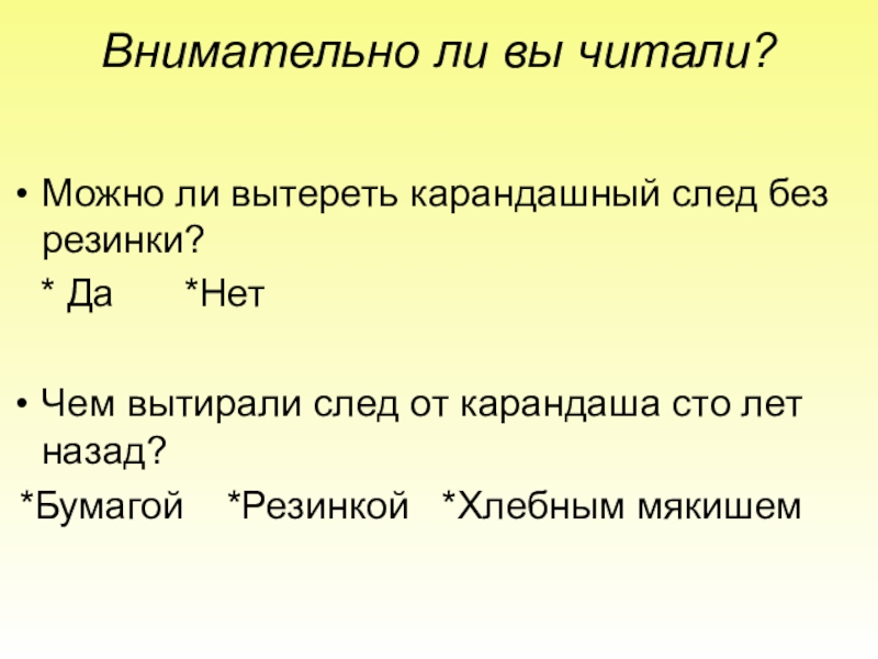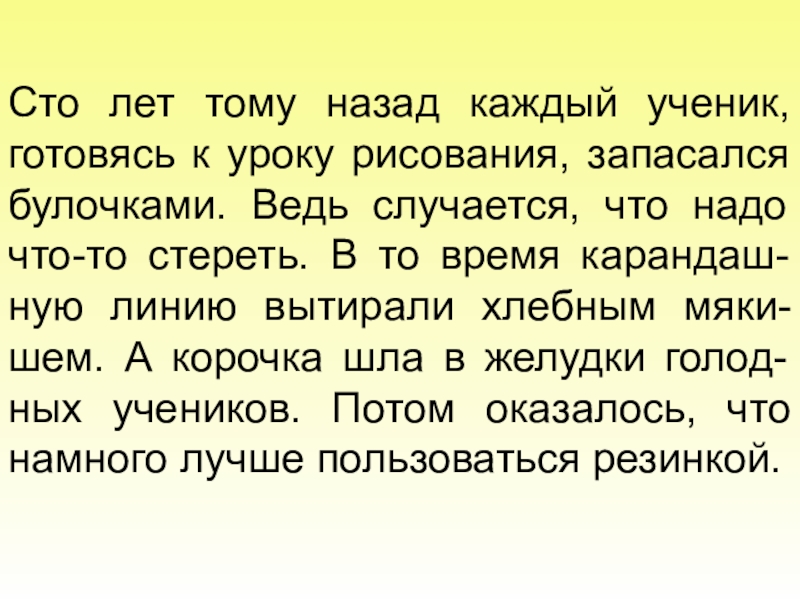 булочками. Ведь случается, что надо что-то стереть. В то время карандаш-ную линию вытирали хлебным мяки-шем. А корочка шла в желудки голод-ных учеников. Потом оказалось, что намного лучше пользоваться резинкой.