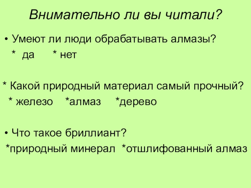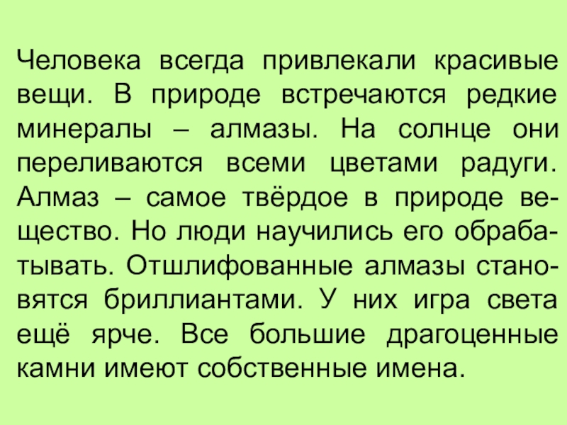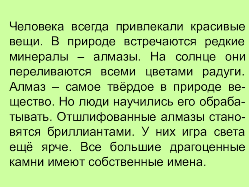 алмазы. На солнце они переливаются всеми цветами радуги. Алмаз – самое твёрдое в природе ве-щество. Но люди научились его обраба-тывать. Отшлифованные алмазы стано-вятся бриллиантами. У них игра света ещё ярче. Все большие драгоценные камни имеют собственные имена.