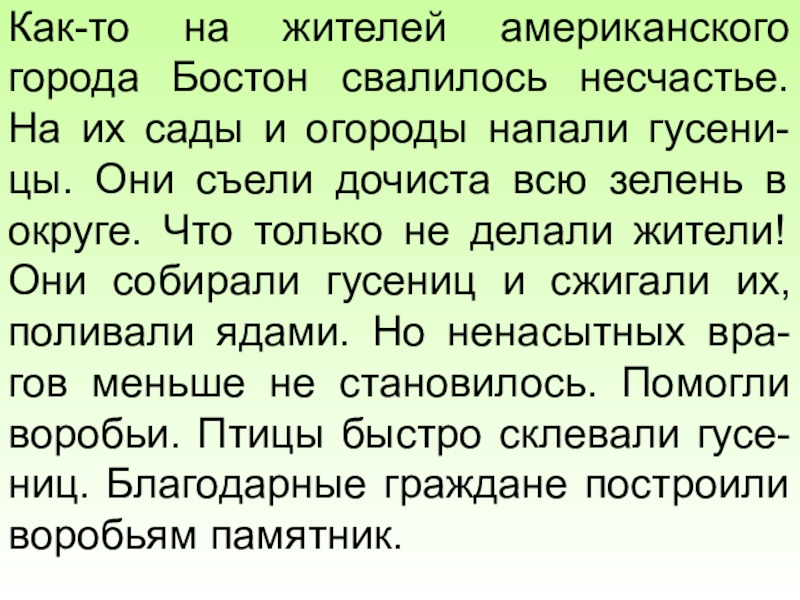 и огороды напали гусени-цы. Они съели дочиста всю зелень в округе. Что только не делали жители! Они собирали гусениц и сжигали их, поливали ядами. Но ненасытных вра-гов меньше не становилось. Помогли воробьи. Птицы быстро склевали гусе-ниц. Благодарные граждане построили воробьям памятник.