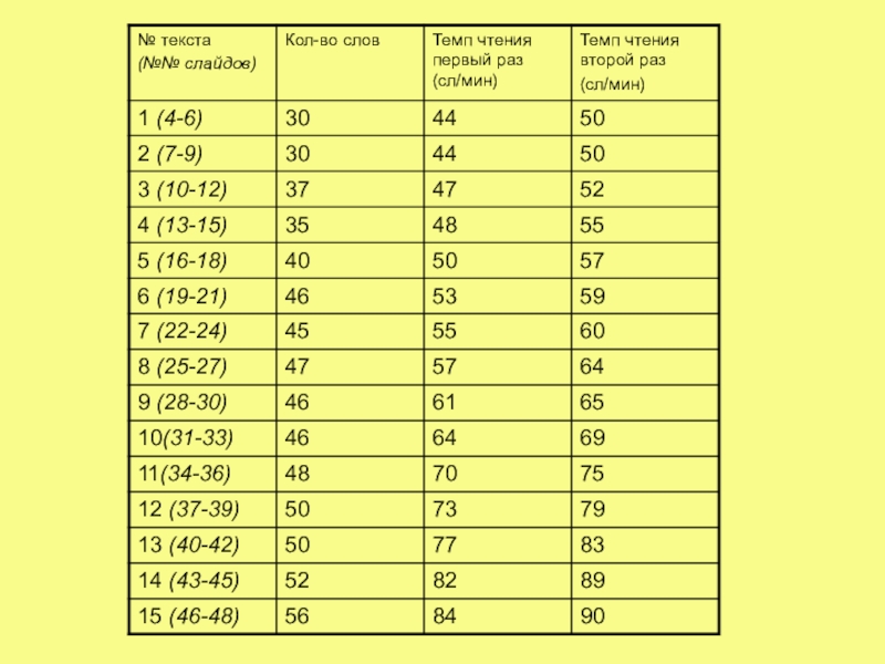 Два первых текста появляются со скоростью 43,9 сл/мин. Повторно – 59 сл/мин. Затем скорость появления текстов увеличивается.