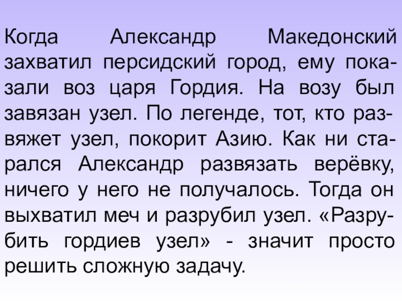 На возу был завязан узел. По легенде, тот, кто раз-вяжет узел, покорит Азию. Как ни ста-рался Александр развязать верёвку, ничего у него не получалось. Тогда он выхватил меч и разрубил узел. «Разру-бить гордиев узел» - значит просто решить сложную задачу.