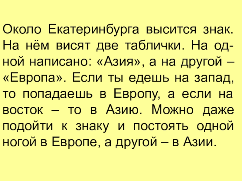 написано: «Азия», а на другой – «Европа». Если ты едешь на запад, то попадаешь в Европу, а если на восток – то в Азию. Можно даже подойти к знаку и постоять одной ногой в Европе, а другой – в Азии.