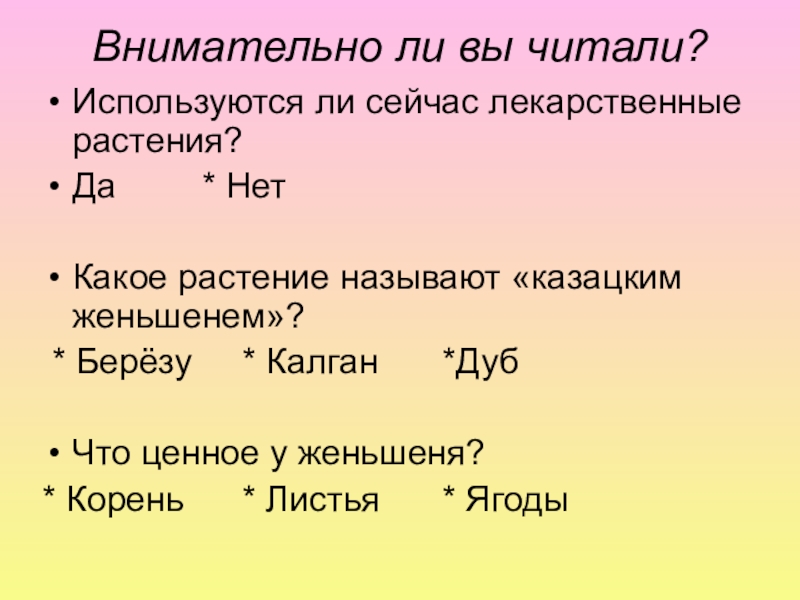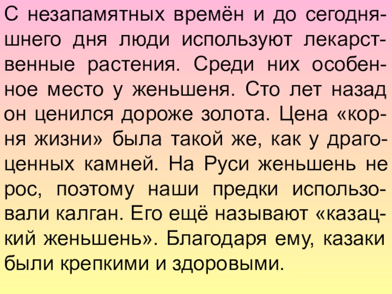 Среди них особен-ное место у женьшеня. Сто лет назад он ценился дороже золота. Цена «кор-ня жизни» была такой же, как у драго-ценных камней. На Руси женьшень не рос, поэтому наши предки использо-вали калган. Его ещё называют «казац-кий женьшень». Благодаря ему, казаки были крепкими и здоровыми.