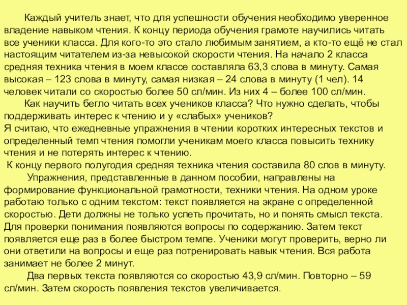 Я считаю, что ежедневные упражнения в чтении коротких интересных текстов и определенный темп чтения помогли ученикам моего класса повысить технику чтения и не потерять интерес к чтению.