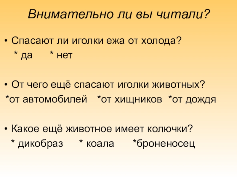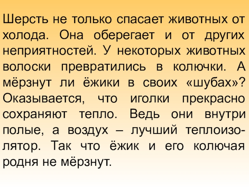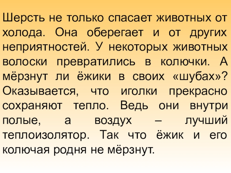 других неприятностей. У некоторых животных волоски превратились в колючки. А мёрзнут ли ёжики в своих «шубах»? Оказывается, что иголки прекрасно сохраняют тепло. Ведь они внутри полые, а воздух – лучший теплоизолятор. Так что ёжик и его колючая родня не мёрзнут.