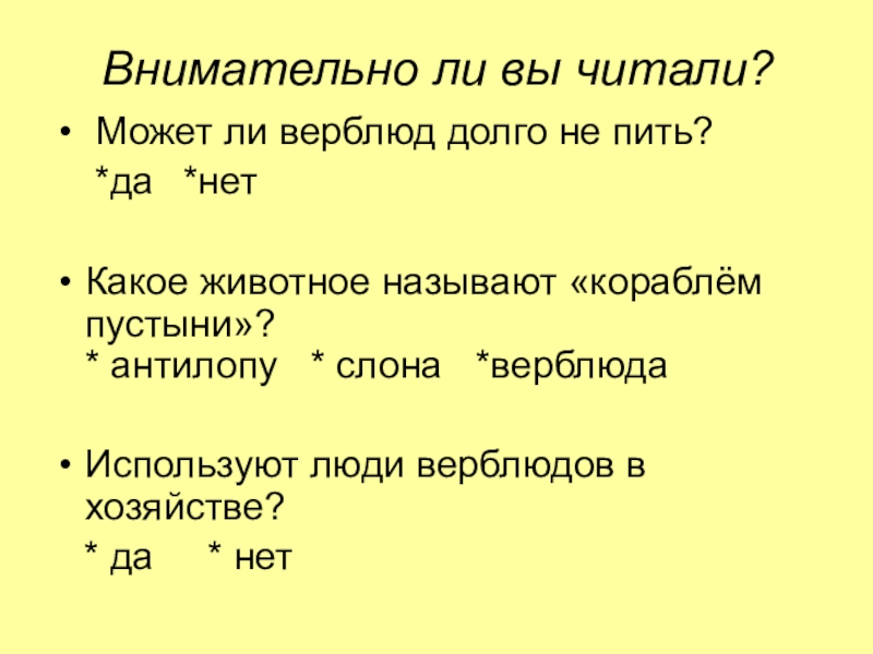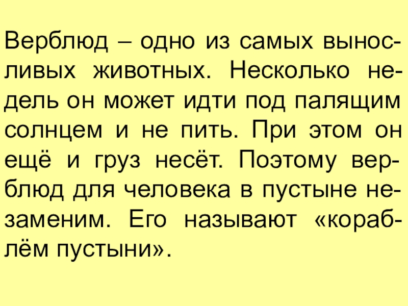идти под палящим солнцем и не пить. При этом он ещё и груз несёт. Поэтому вер-блюд для человека в пустыне не-заменим. Его называют «кораб-лём пустыни».