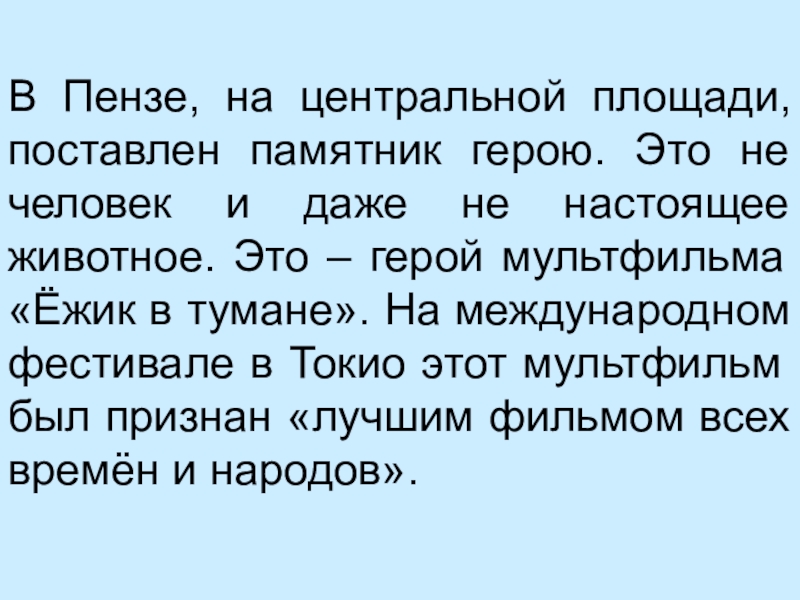 и даже не настоящее животное. Это – герой мультфильма «Ёжик в тумане». На международном фестивале в Токио этот мультфильм был признан «лучшим фильмом всех времён и народов».