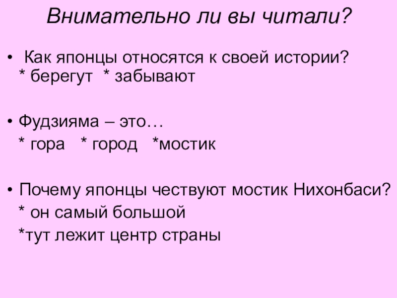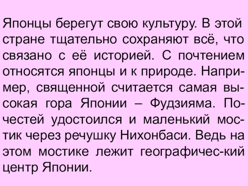 связано с её историей. С почтением относятся японцы и к природе. Напри-мер, священной считается самая вы-сокая гора Японии – Фудзияма. По-честей удостоился и маленький мос-тик через речушку Нихонбаси. Ведь на этом мостике лежит географичес-кий центр Японии.
